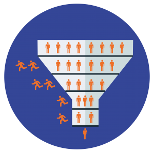 No todas las personas o empresas que entran en contacto con tu compran finalmente. Muchos de ellos irán abandonando a medida que avanza el proceso de compra. Y el comportamiento de los usuarios o clientes potenciales se puede ilustrar con un gráfico en forma de embudo (de ahí su nombre).